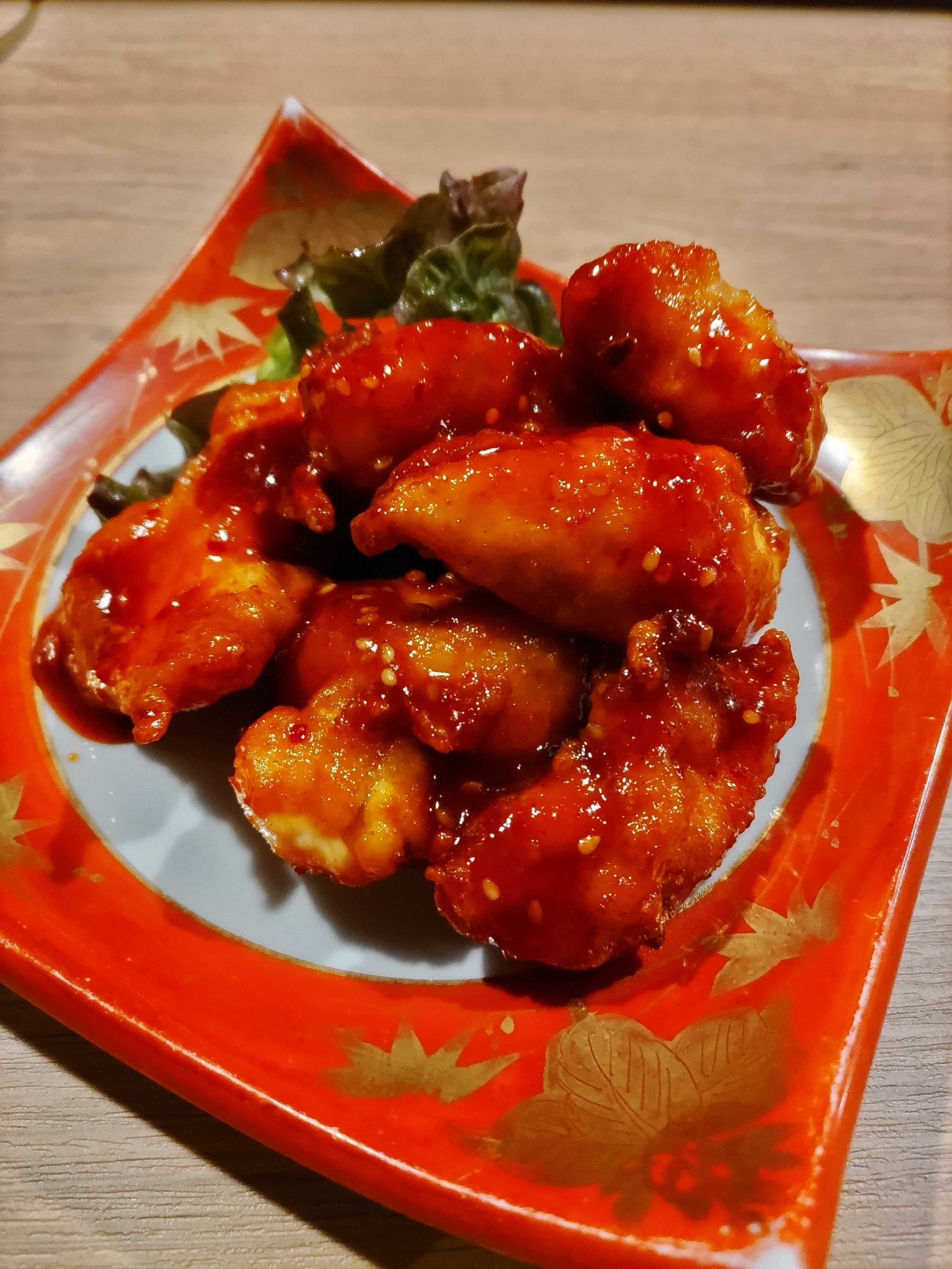 カラッと揚げた、自慢の唐揚げを甘辛い韓国の調味料ヤンニョムに絡めた一品。